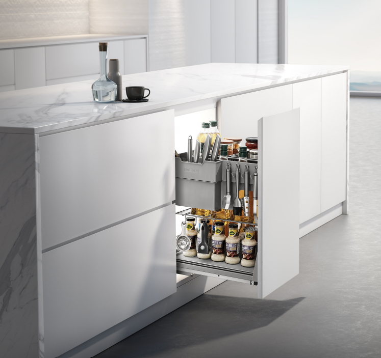 The seasoning pull-out basket keeps knives safely tucked in dedicated compartments and kitchen utensils neatly hung for easy access. Bottles and jars are organized close together, creating a tidy setup that not only stores essentials but also elevates the kitchen’s look and feel with an inviting aroma of spices.