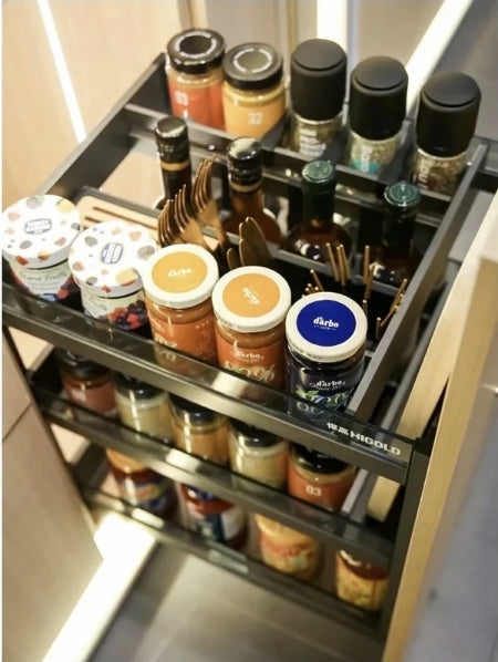 Featuring multiple shelves and thoughtfully divided compartments, this base basket neatly organizes knives, cutting boards, spice jars, and dry goods. Transparent shelves make it easy to see contents at a glance, while the smooth sliding design ensures effortless access.