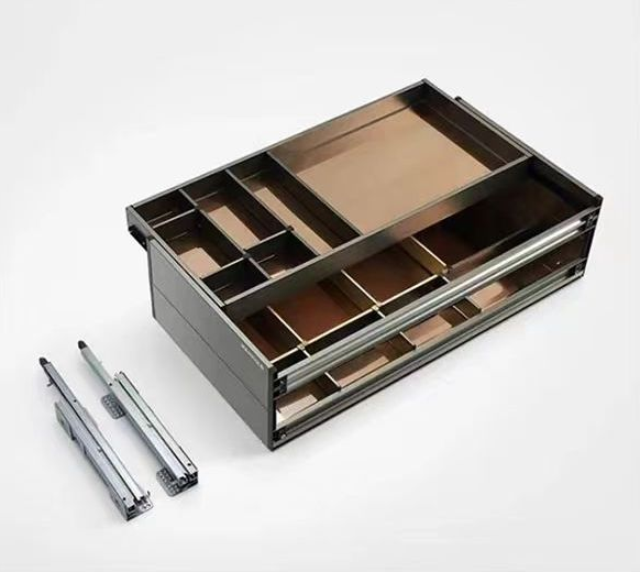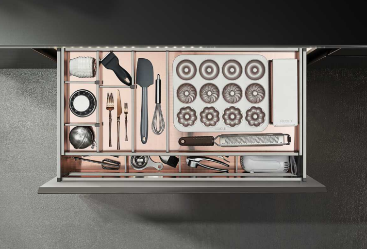 The Shearer 4.0 double-layer drawer is the ultimate solution for elegant kitchen organization, acting like a thoughtful butler for your space. Crafted from durable aluminium, it features ingeniously designed compartments that keep all types of tableware and kitchen utensils perfectly organized and easy to access, while adding a touch of high-end sophistication.