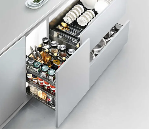 With a layered and compartmentalized design, this base basket neatly organizes cooking oil, sauce jars, dried goods, and more. Small compartments on the upper layer hold small-sized items, while the larger lower compartments accommodate bigger essentials — keeping everything easily visible and accessible.