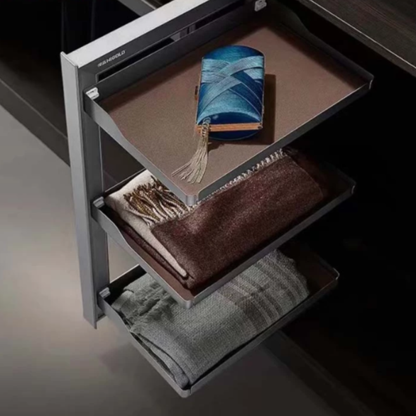 The Side-Mounted Rack features a smart layered design, with an upper tier for delicate items like handbags and lower tiers for neatly stacked clothes or shoes. Its smooth pull-out function keeps everything visible, helping you maintain a tidy and clutter-free space.