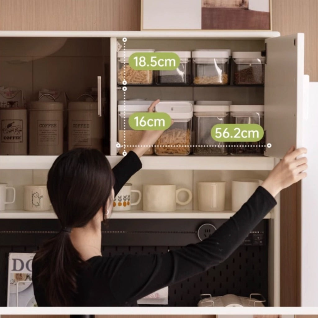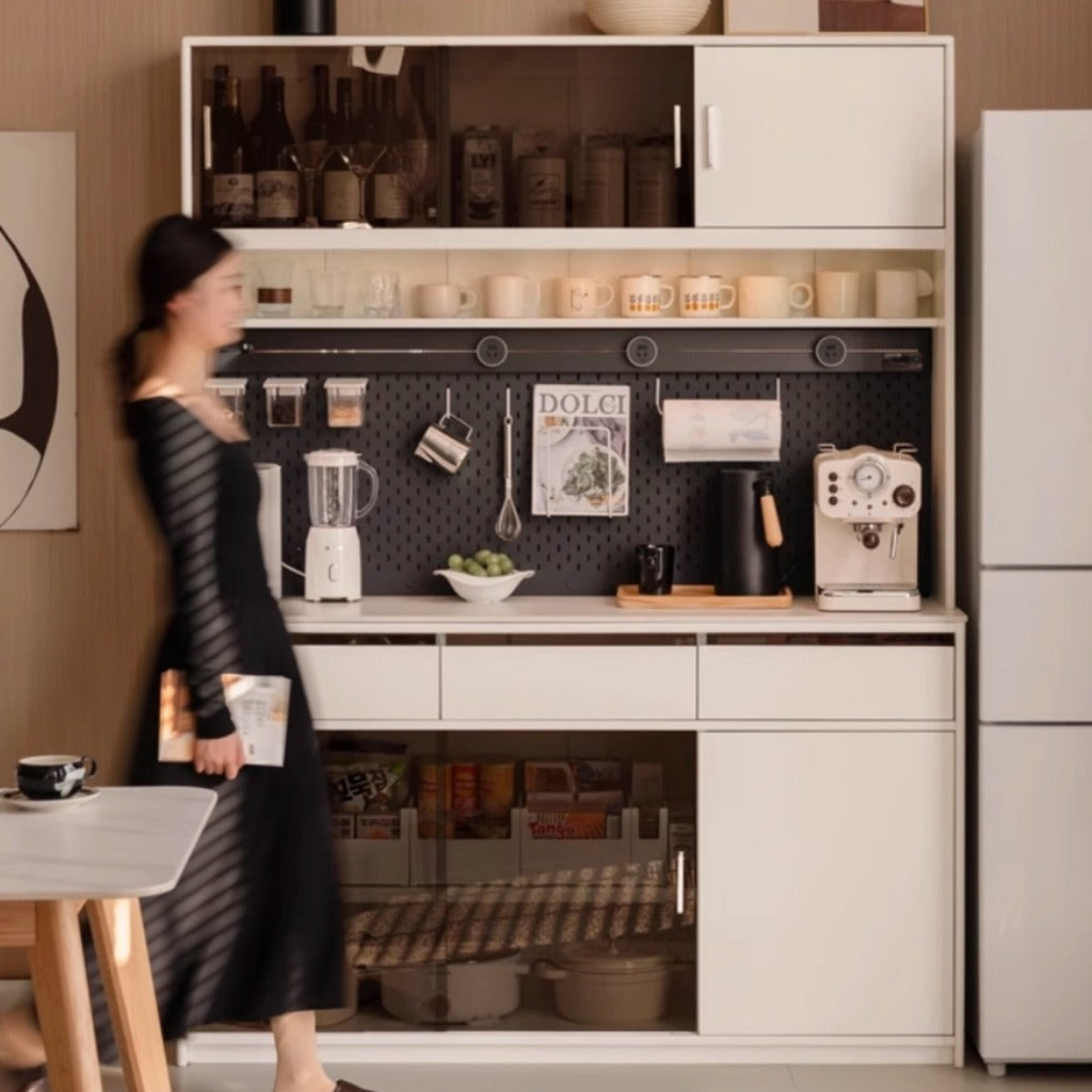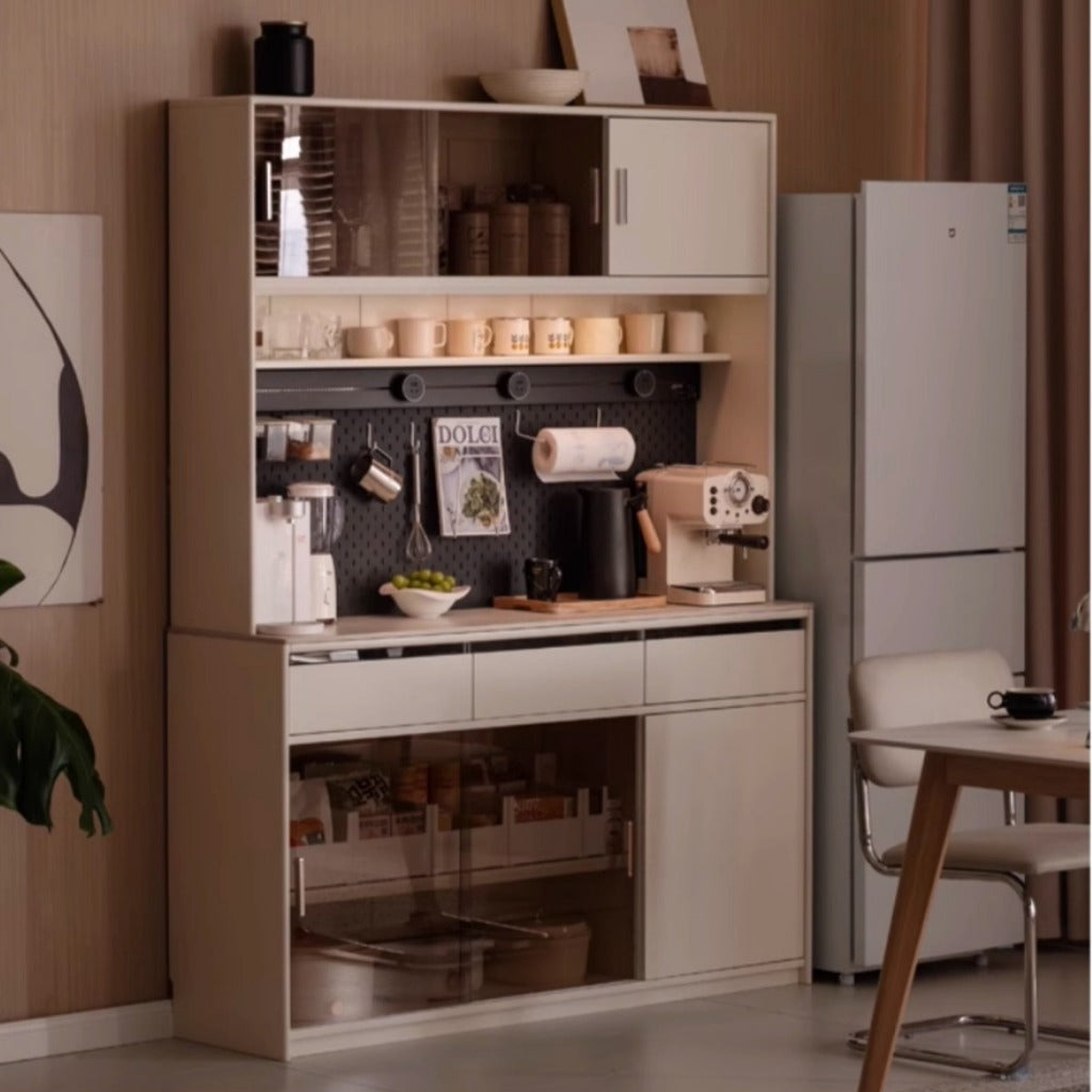 • Ample Storage: Features upper glass sliding doors, multiple drawers, and lower cabinets for organized storage of tableware, appliances, and accessories.