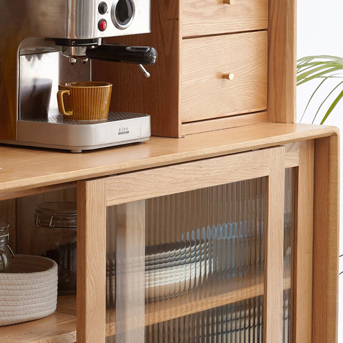 The Judith Narrow Sideboard is exceptionally durable, crafted from solid ash wood with multiple spacious glass cabinets and easy-to-pull drawers for ample storage. Its natural finish highlights the wood’s inherent beauty.