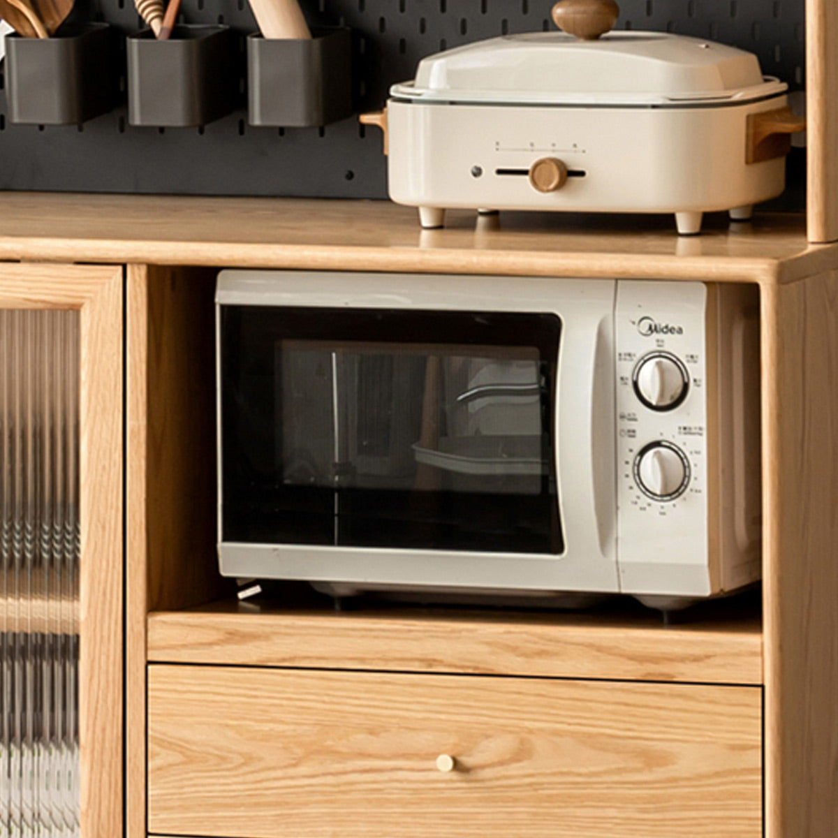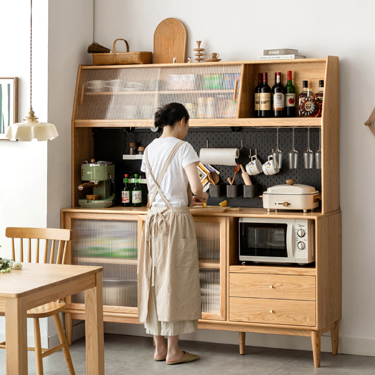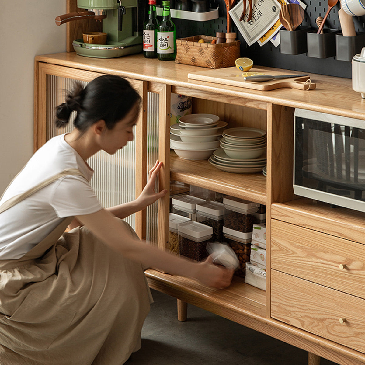 The Judith Wide Sideboard is exceptionally durable, crafted from solid ash wood with multiple spacious glass cabinets and easy-to-pull drawers for ample storage. Its natural finish highlights the wood’s inherent beauty.