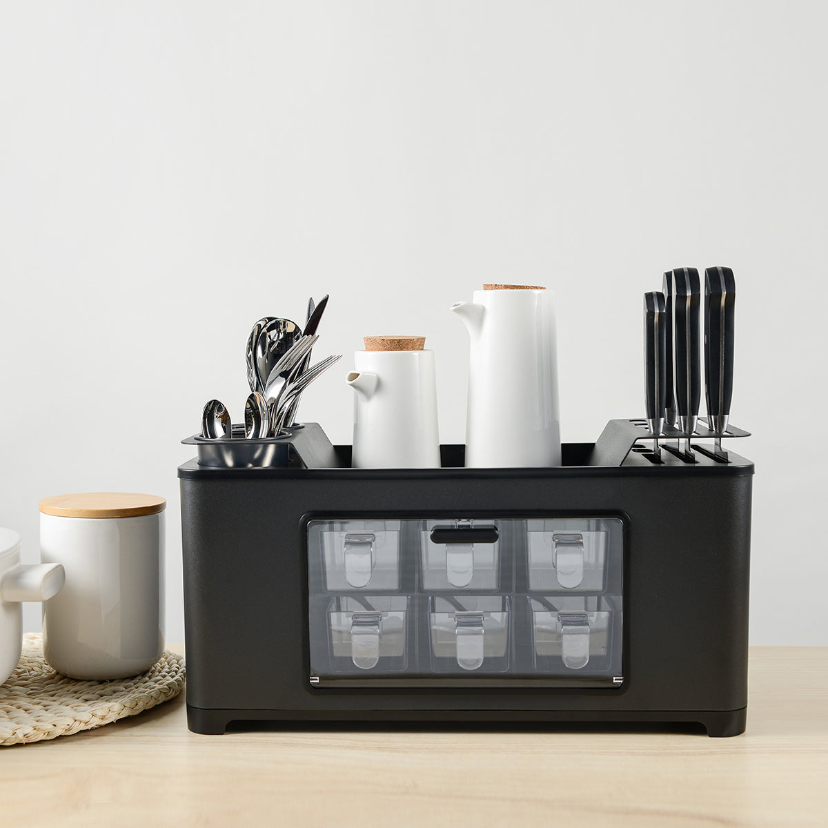 Maximize your kitchen area with this multifunctional countertop spice storage rack. Features a spacious top rack to fit a variety of kitchen utensils, from knives to sauce bottles and built-in individual drawers for easy retrieval.