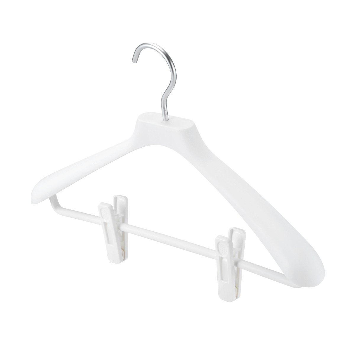 A versatile clothes hanger with clips, made of aluminium and PP, for multi-item hanging.