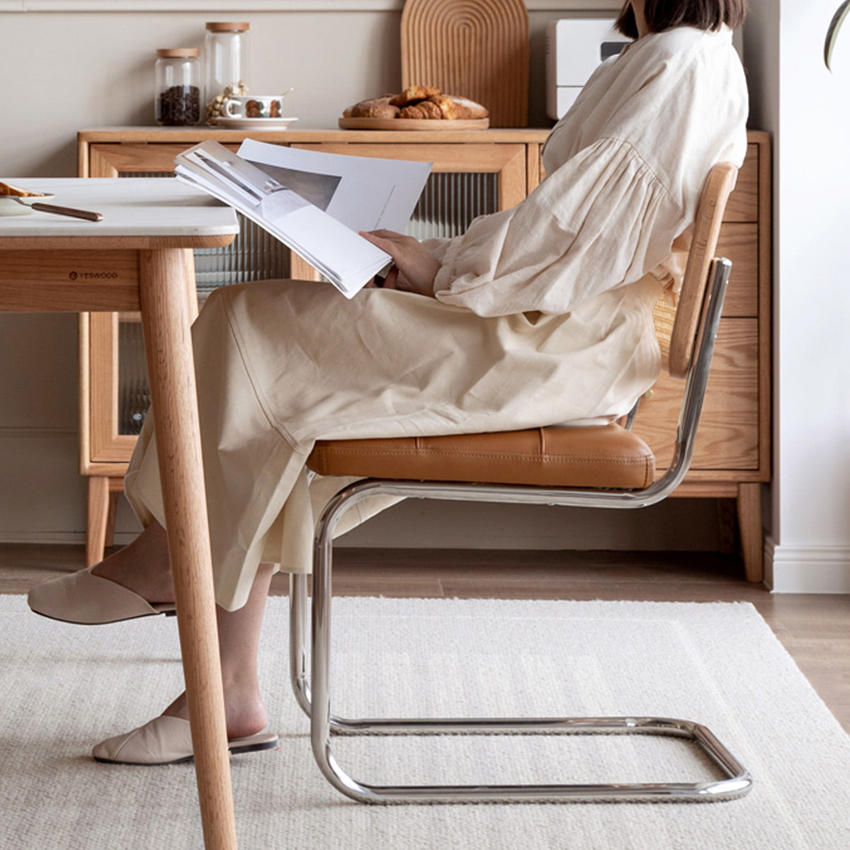 Natural Rattan Backrest – Breathable and supportive, bringing warmth and texture to your dining space.