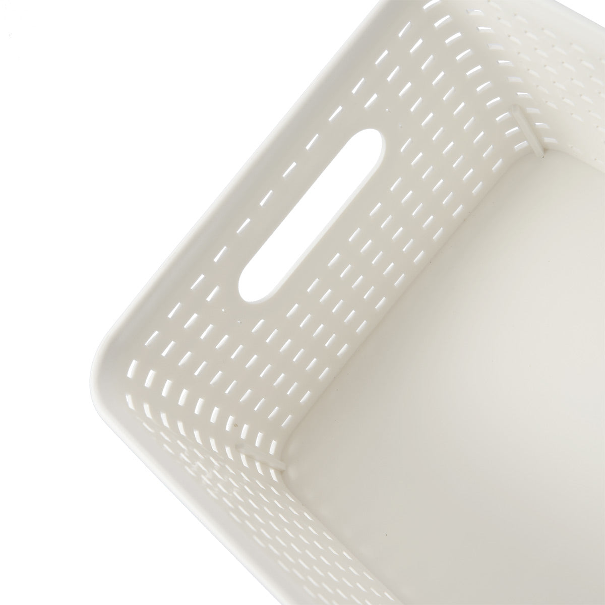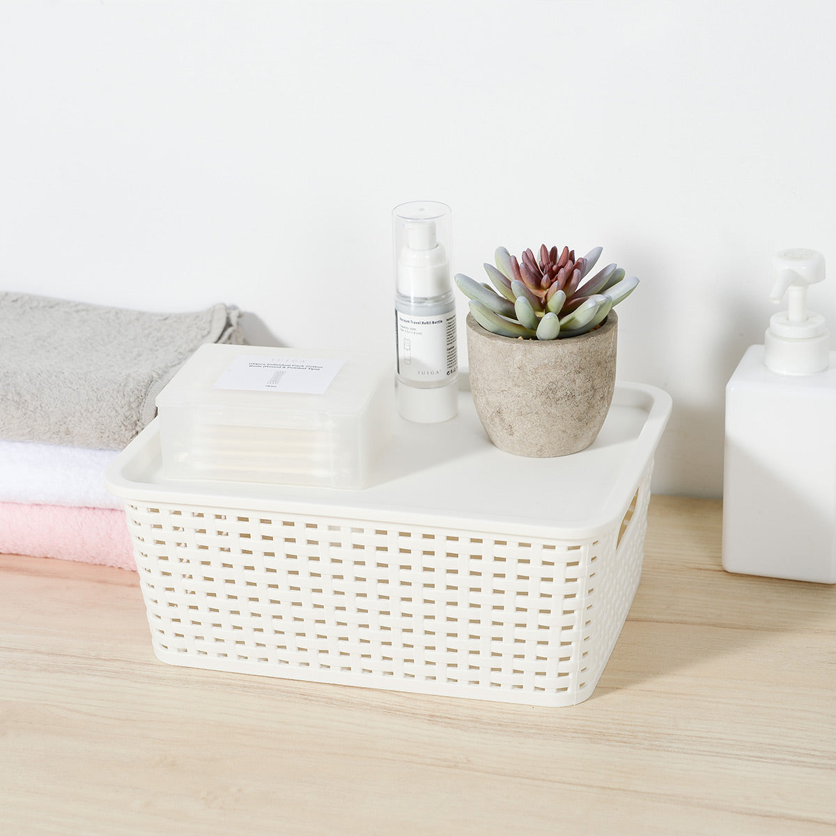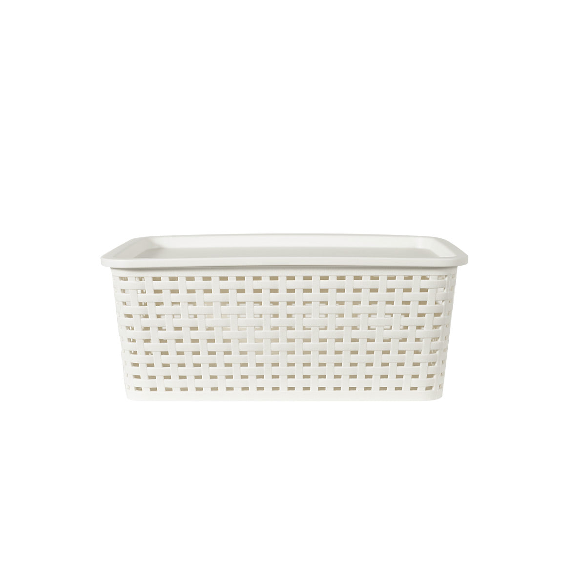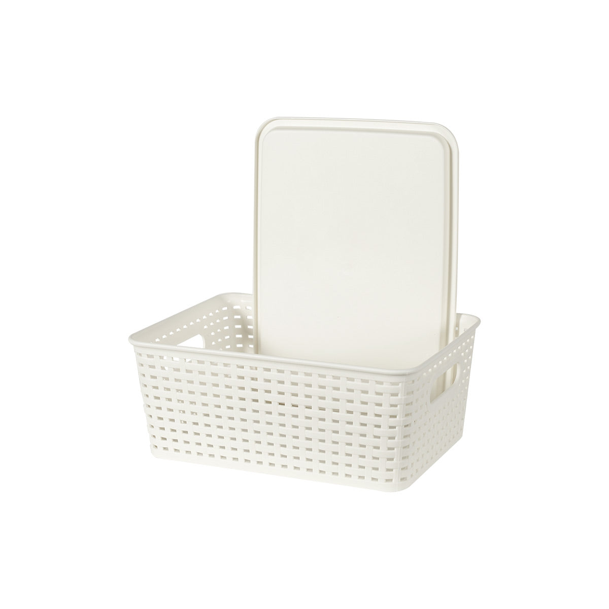 Forget clunky plastic storage bins and go the stylish route with the PP Knit Storage Basket. The classic weave design in white fits in with your existing home decor and works well for storing everything from magazines to craft supplies to linens and laundry. Comes with a lid for easy stacking.