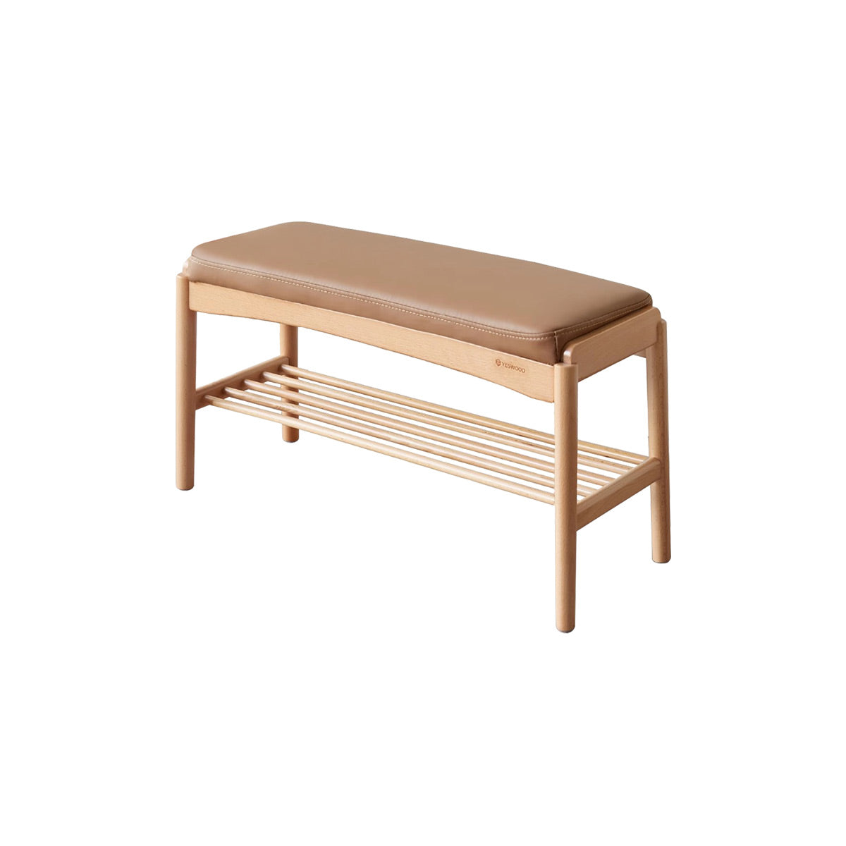 The Shinta Shoe Bench With Faux Leather Cushion features an upholstered seating surface and an additional storage shelf, providing a comfortable spot for changing shoes and convenient storage underneath.